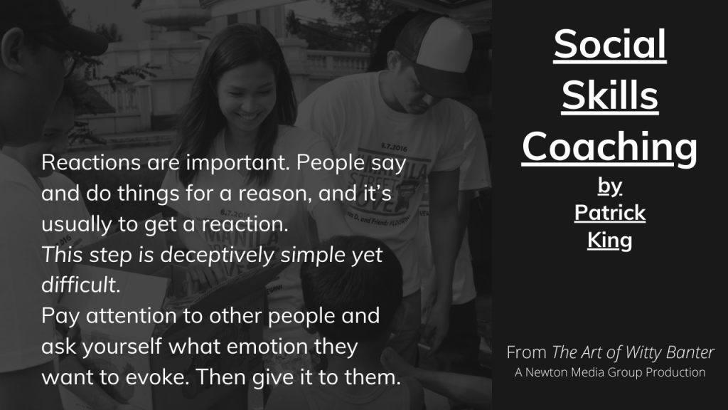 Reactions are important. People say and do things for a reason, and it’s usually to get a reaction. This step is deceptively simple yet difficult. Pay attention to other people and ask yourself what emotion they want to evoke. Then give it to them. Don’t take too long to reply, but being too quick isn’t advisable either. This is all to make others feel that you are present and engaged.