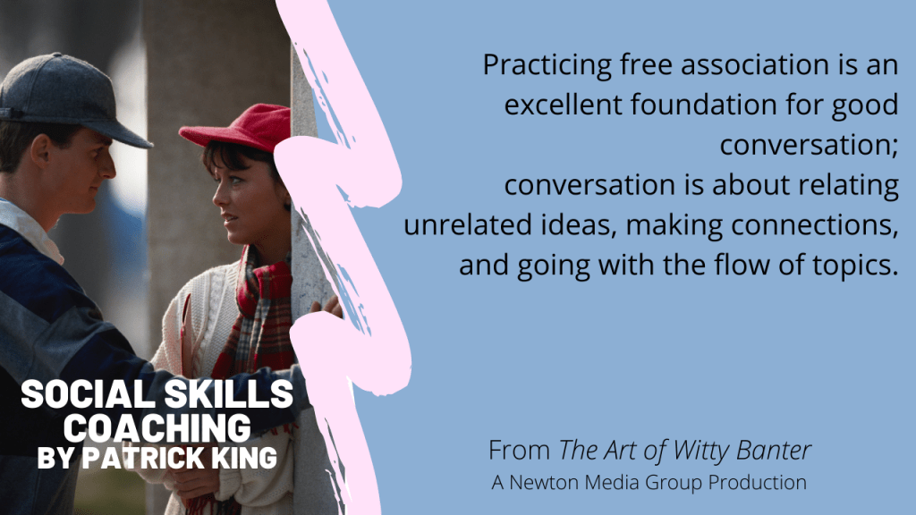 Practicing free association is an excellent foundation for good conversation because conversation is about relating unrelated ideas, making connections, and going with the flow of topics. Next time you’re struggling for something to say, take a step back and tap into your previously practiced free-association skills.
